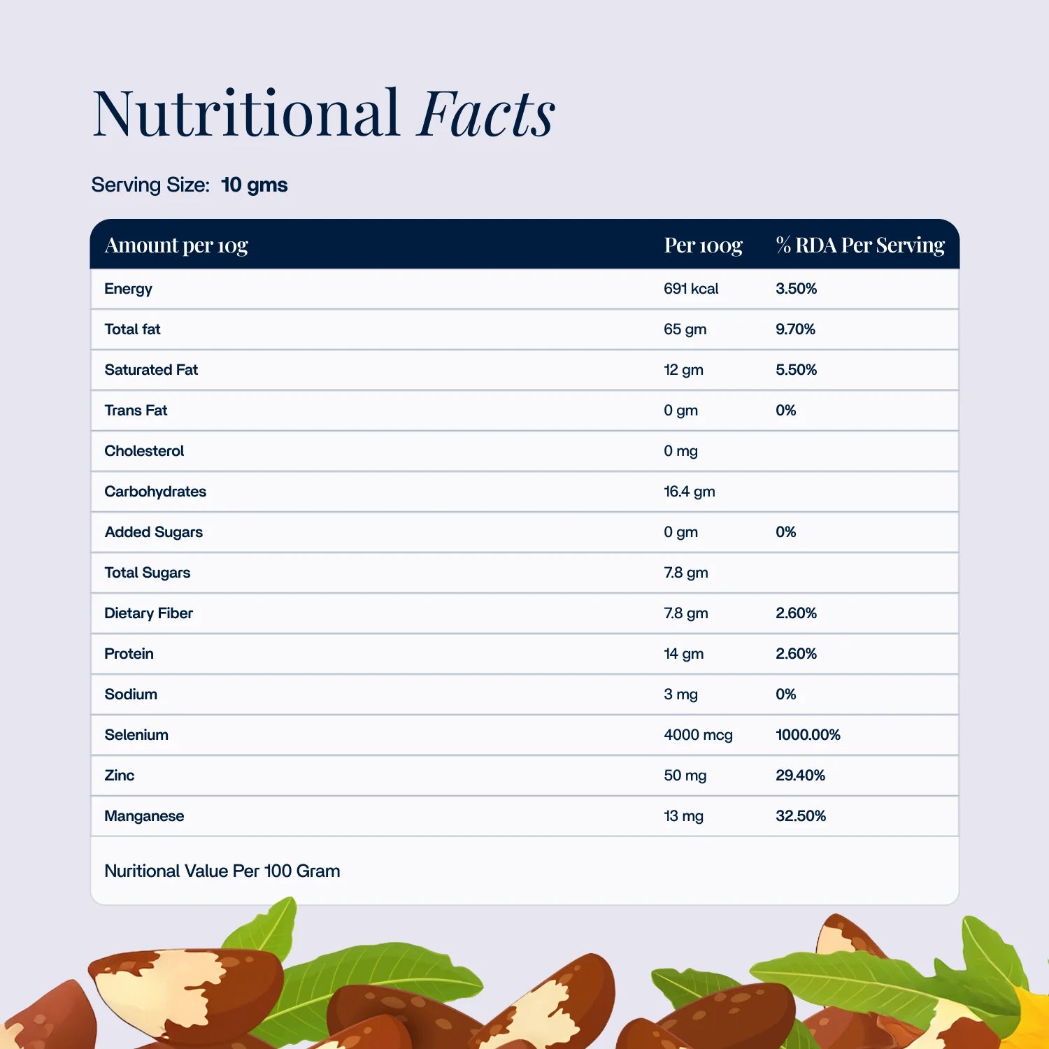 Brazil nuts are an excellent source of selenium, a mineral traditionally linked with daily wellness. Selenium plays a role in overall balance and well-being, which are traditionally associated with daily vitality, inner balance, and overall well-being. Including Brazil nuts in your daily routine is a simple way to support your lifestyle naturally.